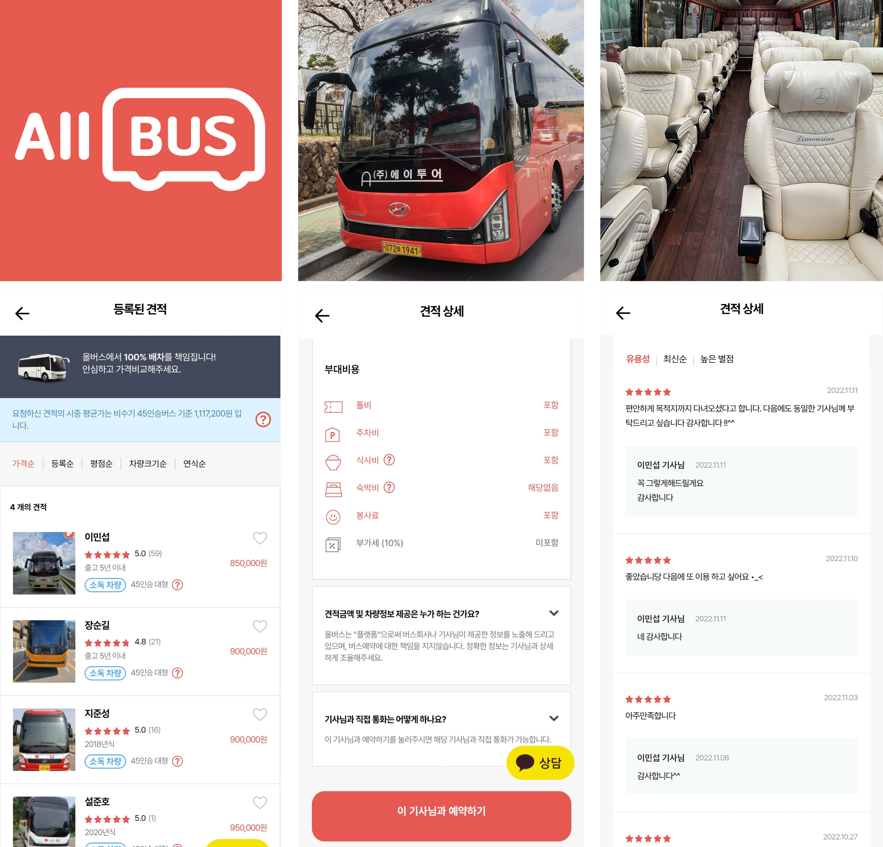 기사님 후기, 버스사진, 버스 연식, 보험 가입 여부 등